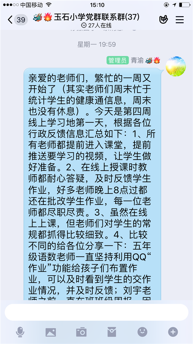 突如其来的疫情冻结了师生们返校的脚步,却没有阻止教学工作前行的步伐。停课不停教,停课不停学,玉石小学积极响应上级教育主管部门的号召,上下“一盘棋”,精心筹划,稳步推进各项教育教学工作,并顺利完成了前4周的线上教学工作。